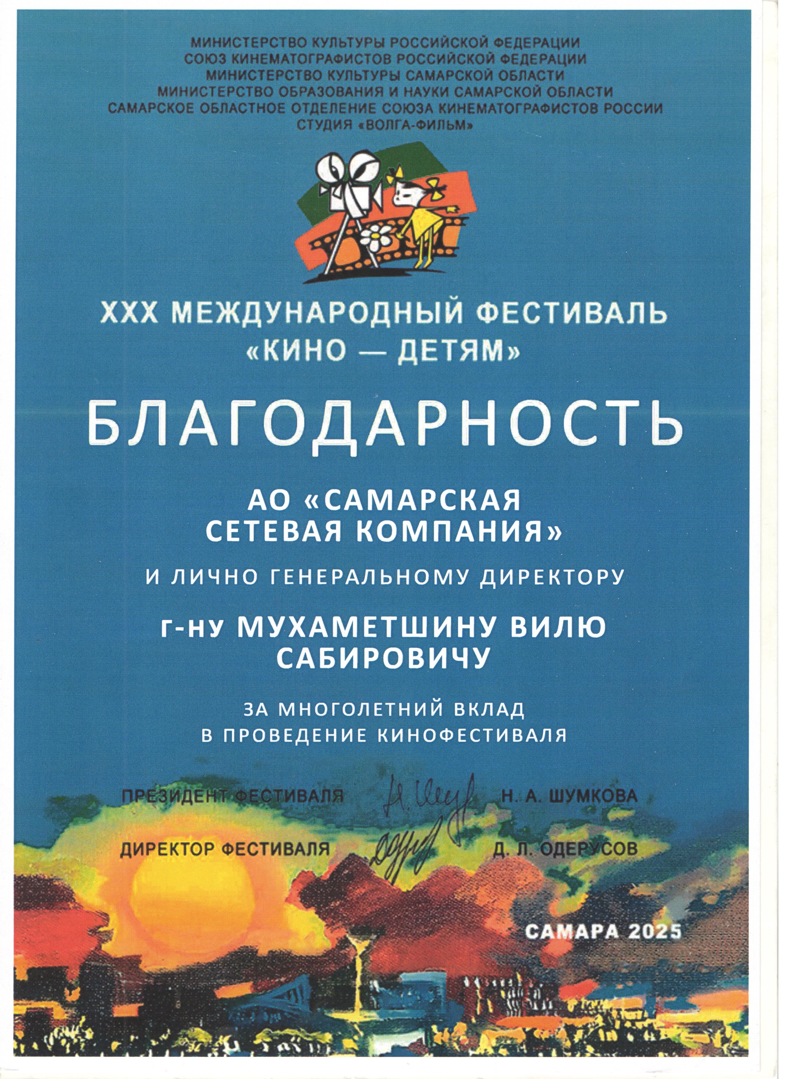 Благодарность XXX Международного фестиваля «КИНО-ДЕТЯМ»