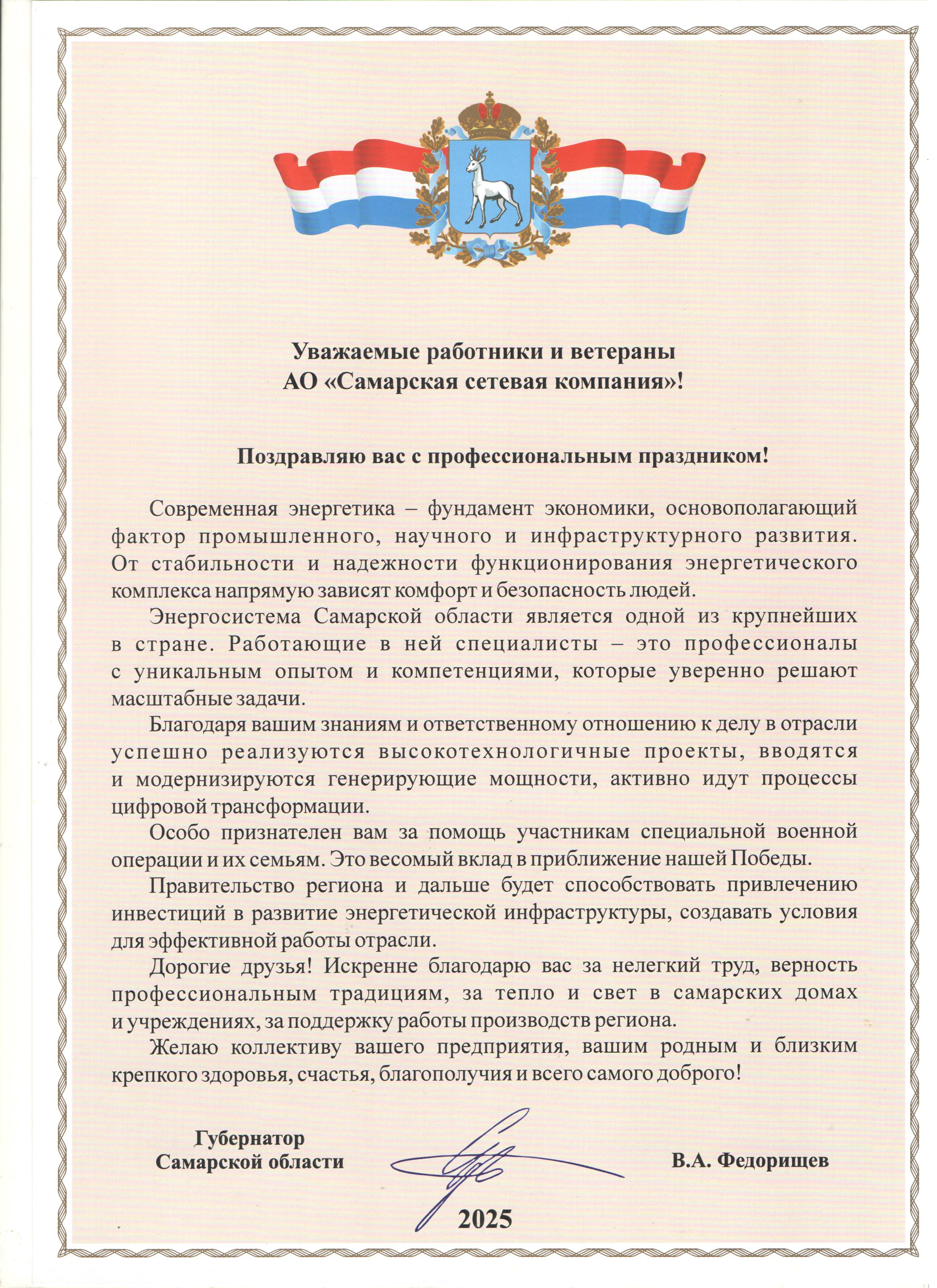 Поздравление губернатора Самарской области В. А. Федорищева с Днем энергетика