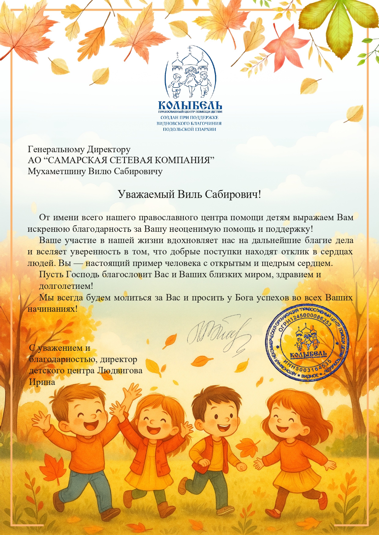 Благодарственное письмо от митрополита Самарского и Новокуйбышевского Сергия