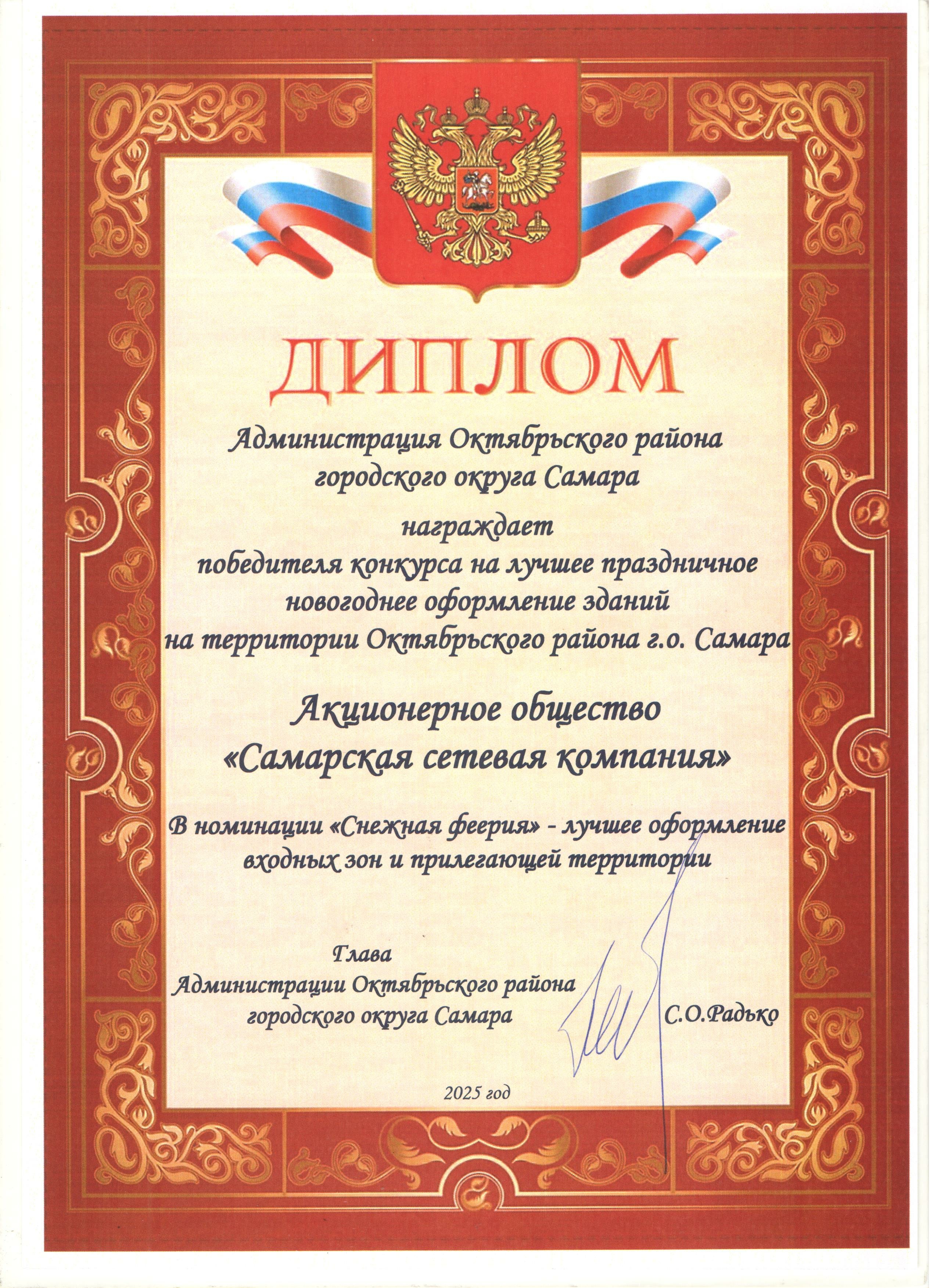 Диплом администрации Октябрьского района г.о.Самара